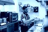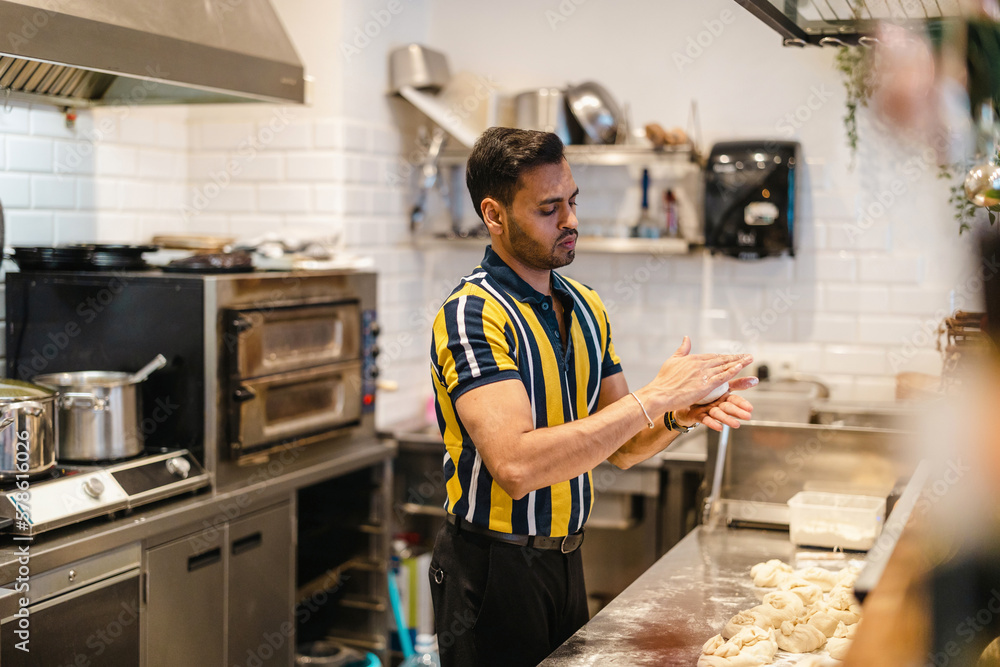 Young man preparing fresh food in commercial kitchen