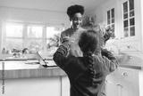 Boy giving mother bouquet and card on Mother's Day or Birthday