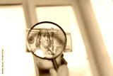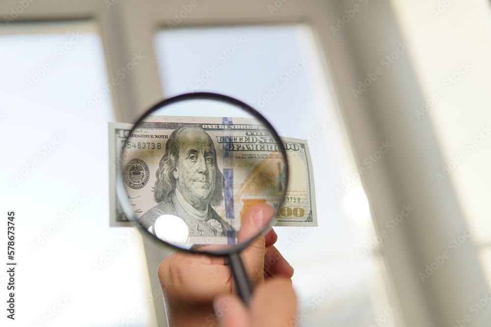 view money under a magnifying glass. Counterfeiter forges banknotes. Fake concept. Fake money American dollars, magnifier. watermark, water mark