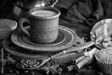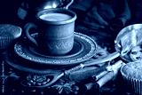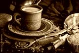 Espresso coffee with coffee beans on old background.