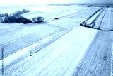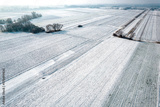 Ośnieżone pola na polskiej wsi. Wiejski, zimowy krajobraz. Zima.