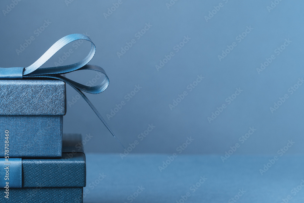 Two Luxury gift boxes with a blue bow on dark blue. Side view monochrome . Fathers day or Valentines day gift for him. Corporate gift concept or birthday party. Festive sale copy space banner