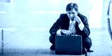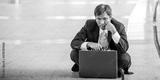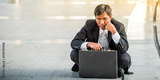 business man in suit frustrated he sad for lost work job sit on street upset fail unhappy after Fired from covid19. Many employee unemployed to reduce expenses salary income dismissal