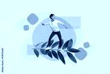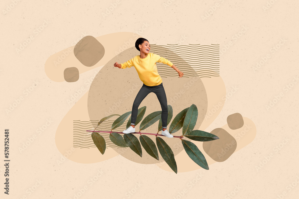 Collage image photo poster postcard picture artwork of happy positive girl moving ahead green branch isolated on drawing background