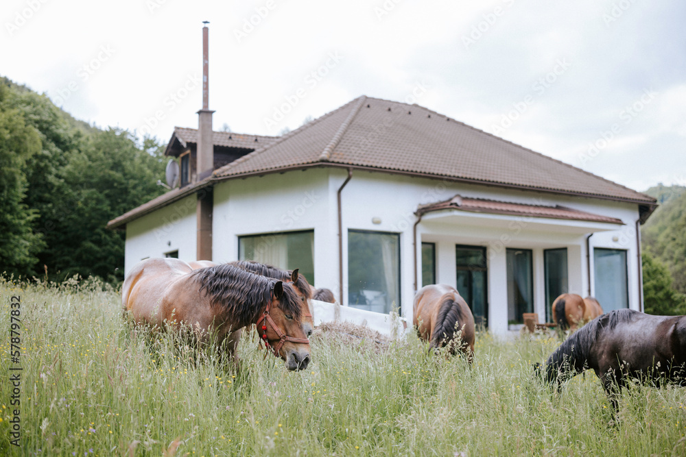 Group of horses gallop across the open range, their energy and power a testament to the resilience of the natural world. majestic creatures adapt and thrive in the diverse natural environment