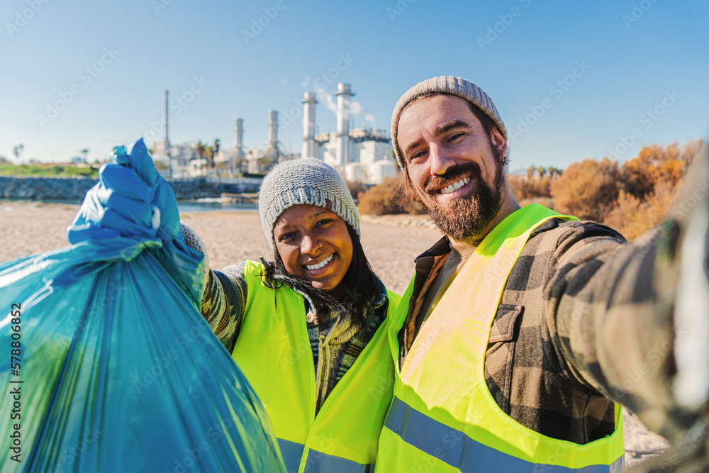 A environmental activist or volunteer multiracial couple picking up trash og the beatch, and taking a selfie portrait smiling looking at camera showing a recycle plastic bag. High quality photo