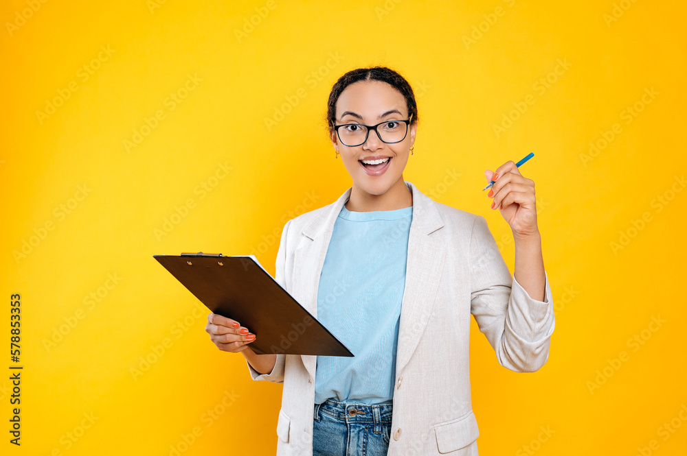Excited happy emotional brazilian or latino elegant woman with glasses, financial manager, recruitment, broker, in elegant wear, stand on isolated background, holds documents, amazed looks at camera