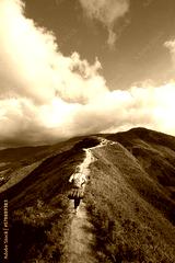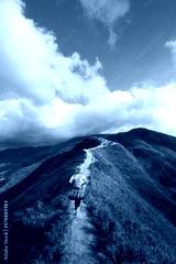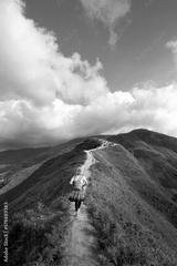 Hiking tourists explore the trail on spine and the top of the mountains Ta Xua. This is a very popular tourist destination in VN