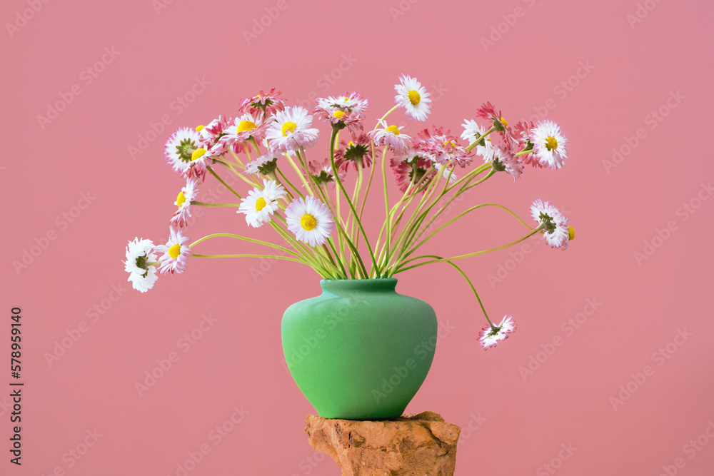 Bunch of daisy spring flowers in a tiny green vase on table. pink red background with copy space. Blooming flowers. Greeting card. Border banner