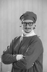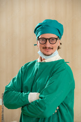 Man male surgeon doctor portrait in Green coat gown with stethoscope, waist up. Medical senior attractive friendly smiling clinic arms crossed wear Green lab coat stand in hospital patient room