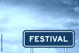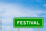 Green color transportation sign with word festival on blue sky with white cloud background