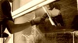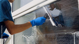 Male professional cleaning service worker in overalls cleans the windows and shop windows of a store with special equipment