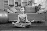 Little girl meditate. Child do yoga, breathing exercise, relax alone with closed eyes in lotus pose.