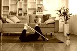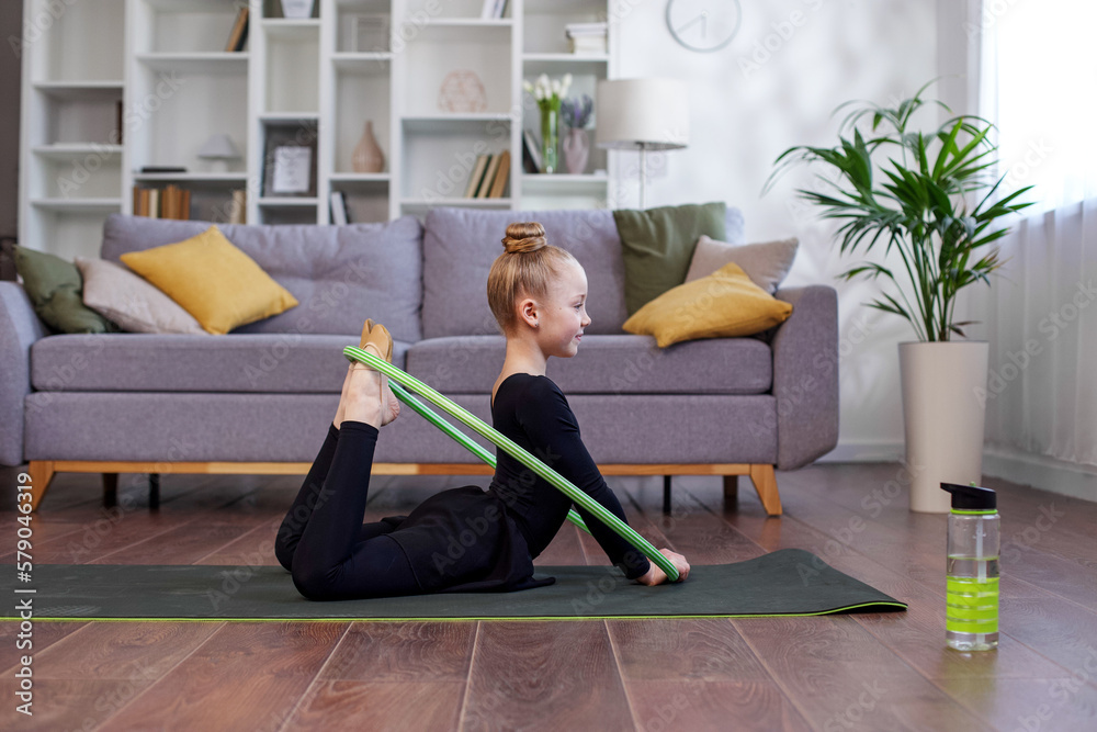Little girl practicing stretching in room. Physical exercises for children at home. Hula hoop.