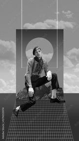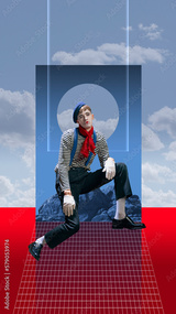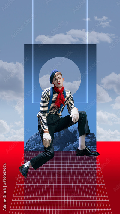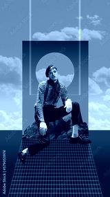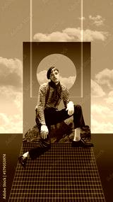 Surreal design in futuristic style. Contemporary art collage. Manin image of pantomime sitting over abstract design elements with sad face. Hidden feelings and emotions. Concept of surrealism