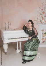 Beautiful thoughtful woman wearing green medieval vintage Victorian Style dress sitting near piano