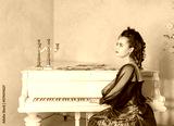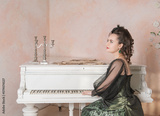 Beautiful thoughtful woman wearing green medieval vintage Victorian Style dress sitting near piano