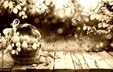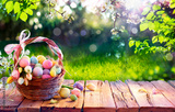 Easter Eggs In Basket On Aged Wooden Table In Spring Garden With Sunlight