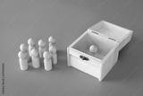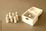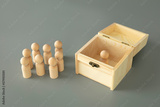 Think outside the box concept. Wooden figures and a box on grey background. Be brave and do it, join us.