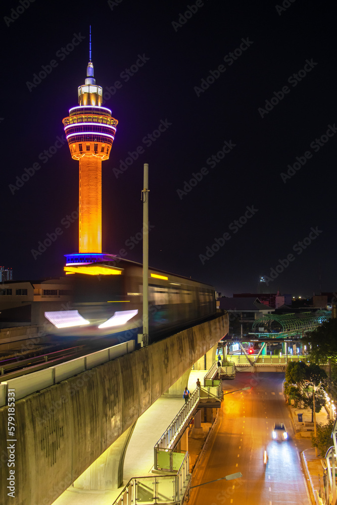 The night train rides on the viaduct under the illuminated observation , SAMUT PRAKAN, THAILAND