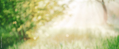 Blurry abstract scenic natural green background. Blurred green grass in sunny day with copy space. Sunshine on beautiful grass in blur. Morning nature in sunlight. Defocused backdrop with sunbeams.