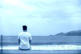 Young calm sad serious man is sitting on embankment near sea, ocean on beach, thinking, meditate on natural background