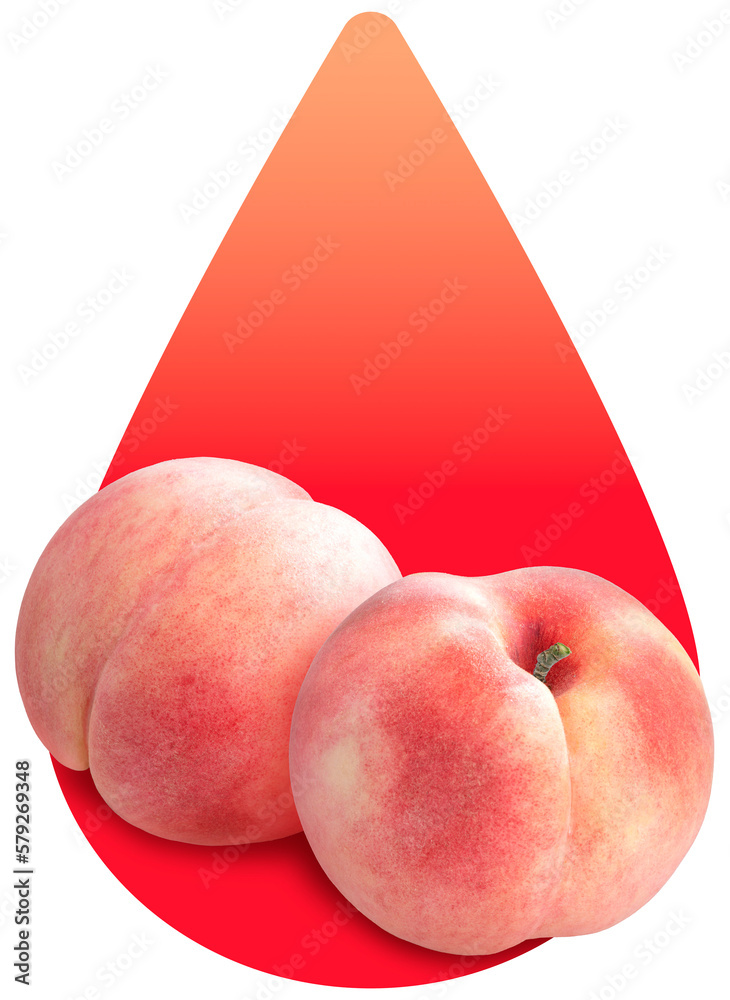 Peach fruit with leaf on Red water drop shape background, Fresh Peach on red Background PNG File.
