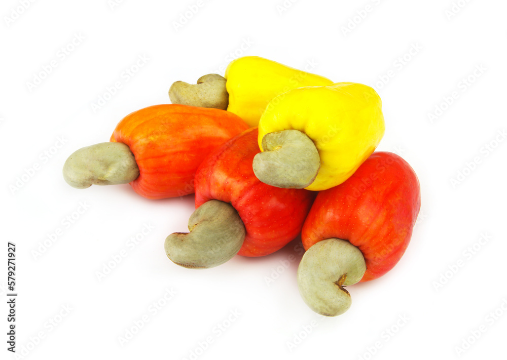 Raw red and yellow cashew fruits with nuts isolated on white background.