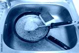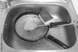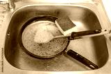 Wash the pan and pour the old oil into the sink. causing clogged sinks and drains.