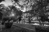 View on beautiful autumn scenery big tree on the pond shore edge in city park among green sedge grass and many trees in the summer evening light Sunset background.