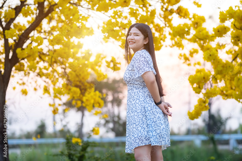 Happy Relaxing Portrait asian woman in Beautiful blooming Yellow Golden Tabebuia Chrysotricha flowers with the park in spring day at Evening background in Thailand.