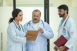 Three doctor hold clipboard document file of patient record talking discussion about treatment guidelines. Group surgeon doctor talk consult advice to assistance expertise for ICU therapy case.