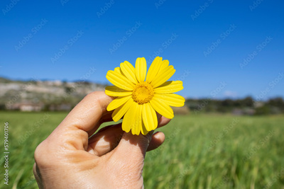 Close-up of yellow daisy flower in hand in front of green grass and blue sky