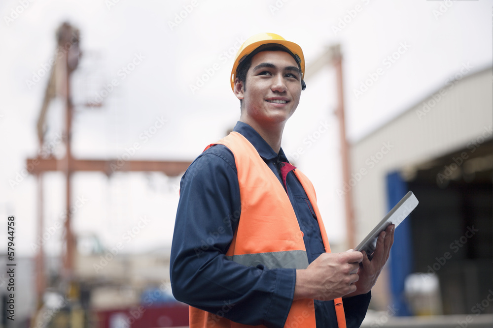 Proud young worker in protective work wear in a shipping yard