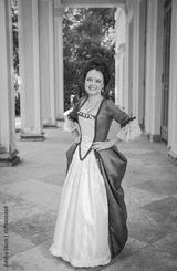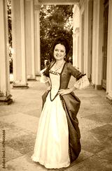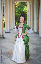 Beautiful young smiling woman in green old-fashioned medieval dress