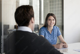 Two business people sitting at a conference table and discussing during a business meeting