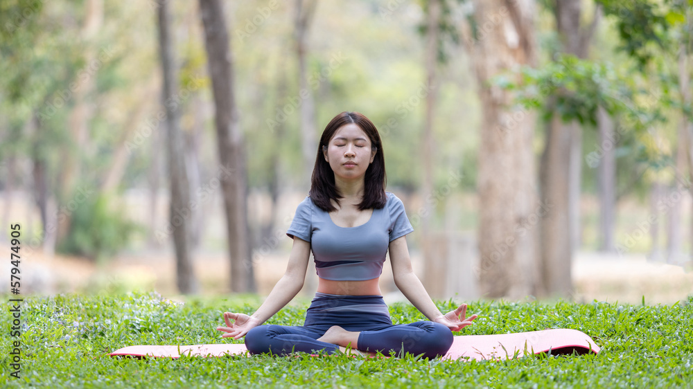 Asian woman doing yoga in nature in the forest, Meditation and breathing exercises, Treat ADHD and train your mind to be calm, Healthy exercise, Mindfulness, Homeopathy, Park yoga.