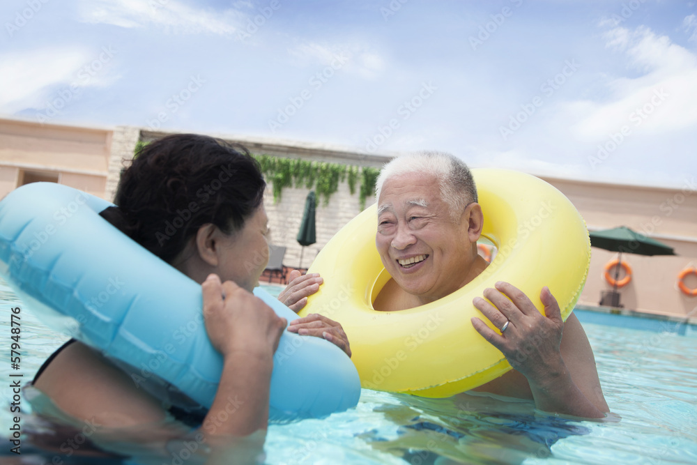 Senior couple smiling and relaxing in the pool with inflatable tubes