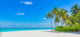 Beautiful amazing beach. Tropical shore background as summer landscape, white sand calm sea sky banner. Tranquil beach scene vacation and summer holiday concept. Dream sunny panoramic nature paradise