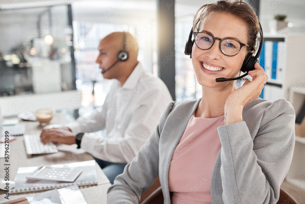 Call center, happy and consultant portrait in office for telemarketing, communication and contact us query. Working, online and customer service woman ready for call in corporate workplace.