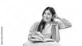 Asian woman reading a novel on the sofa in the living room, Weekend leisure activities, happiness during vacation at home, Favorite corner of the house, Beautiful woman smiling sweetly.