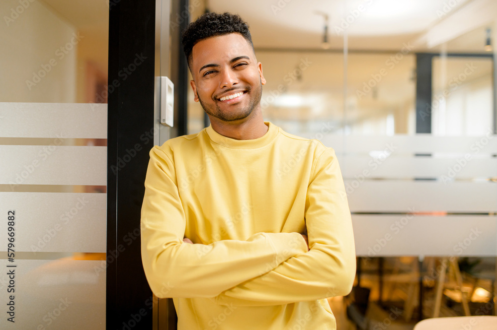 Smiling indian businessman standing in modern open space office and looking at the camera. Young positive male student, proud and successful multiracial small business owner