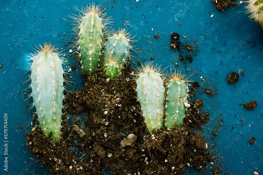 Transplanting replanting cacti. Spiny green cactuses in ground on blue surface top view. Plants growing, cultivation. Gardening, horticulture. Home garden Blue Pilosocereus Magnificus Cactus Succulent