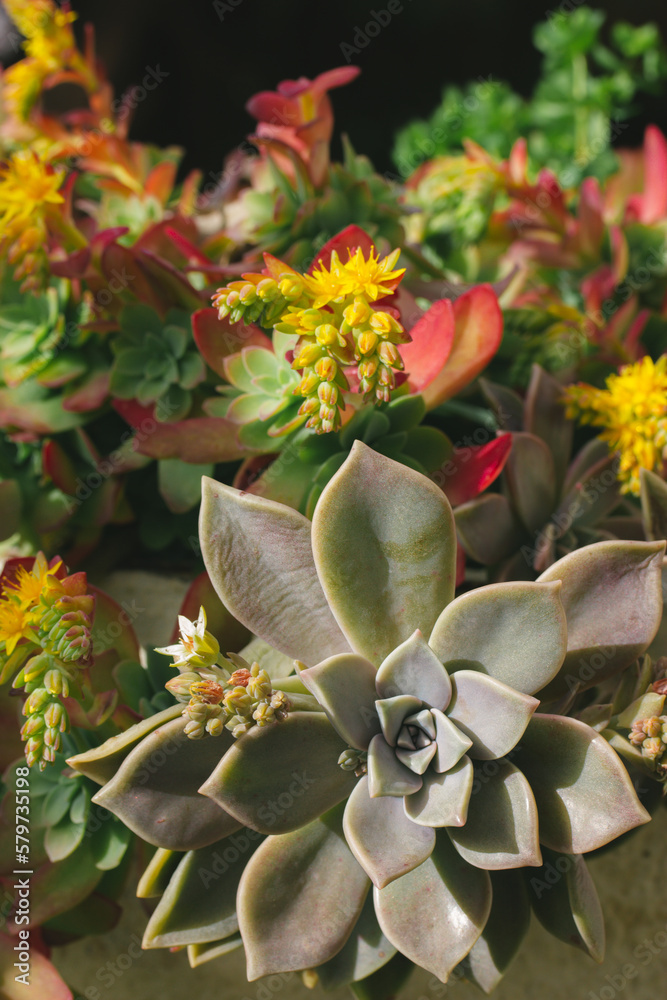 Vertical floral background poster with green blue succulents leaves and small blossoming yellow flowers in tropical garden. Plants in bloom. Graptopetalum paraguayense. Ghost plant blooming in spring.