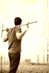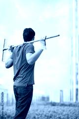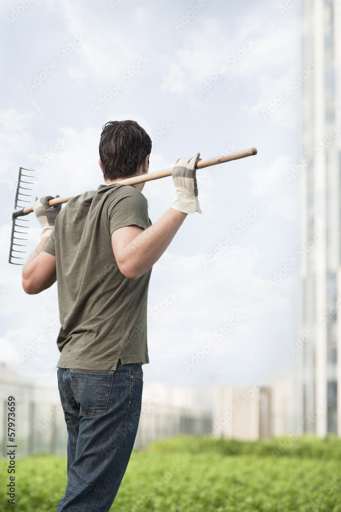 Young man holding a rake on his shoulders and looking at green plants in a roof top garden in the city