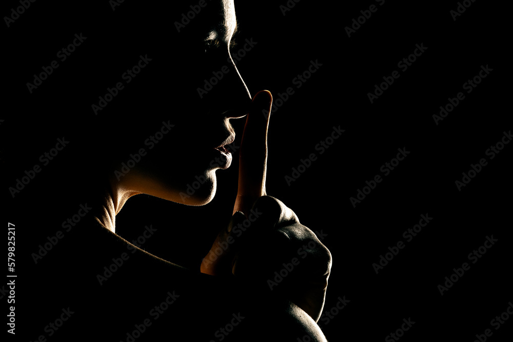 Silhouette of unknown woman with the face in the shadow holding finger on her lips on a black background