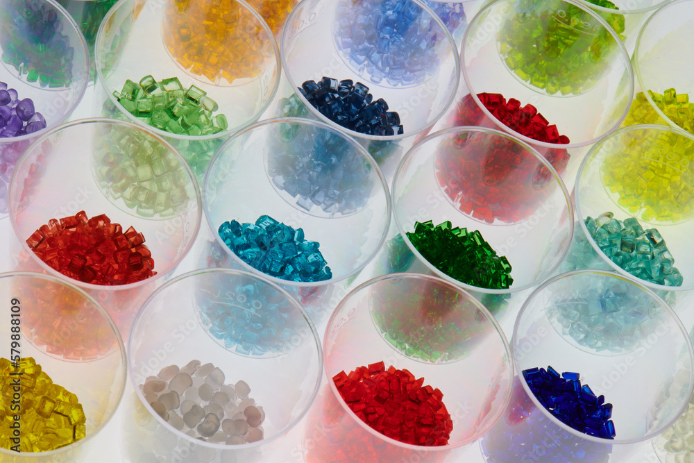 Colored plastic resins in test tubes in laboratory