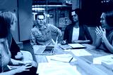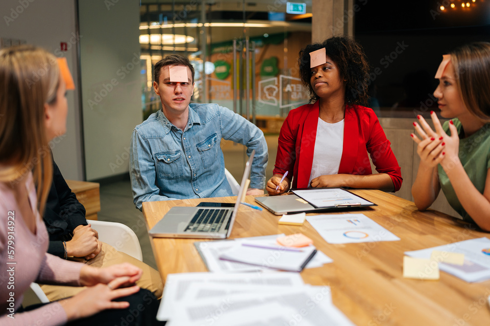 Multiethnic happy startup team playing guessing game with sticky notes on forehead after work for entertainment. Cheerful multiracial group of colleagues having fun together with charades in office.