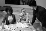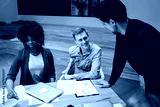 Side view of successful business team leader standing surrounded by diverse colleagues, confidently looking to staff. Multiethnic startup business team posing at table in modern meeting office room.
