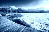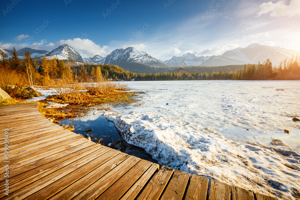 Sunny landscape of a frozen mountain lake on a frosty day. Strbske pleso, High Tatras national park, Slovakia, Europe.
